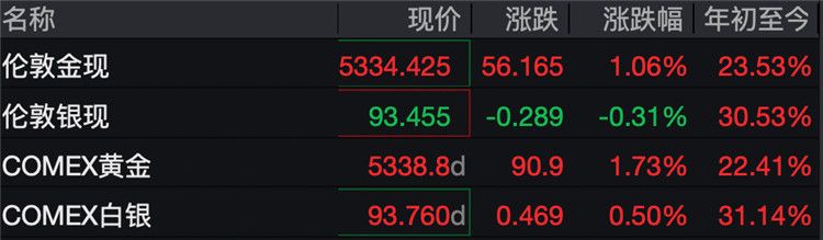 Wind数据显示,截至记者发稿,COMEX黄金报5338.8美元/盎司,涨1.73%,最高一度站上5400美元/盎司上方,至5409.7美元/盎司。伦敦金现报5334.425美元/盎司,涨1.06%,最高摸至5393.41美元/盎司。