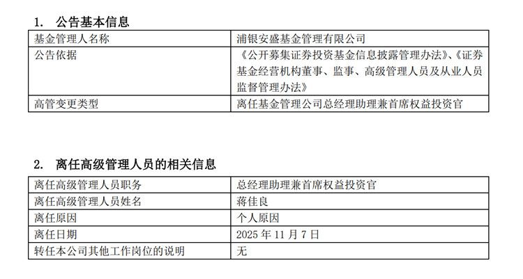 近日,浦银安盛基金管理有限公司(以下简称“浦银安盛”)发布高级管理人员变更公告,总经理助理兼首席权益投资官蒋佳良因个人原因离任,离任日期为2025年11月7日。