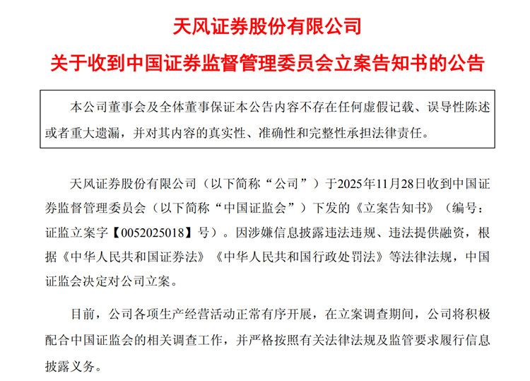 证监会一纸立案通知书,将天风证券推上风口浪尖。近日,天风证券发布公告称公司于2025年11月28日收到证监会下发的《立案告知书》(编号:证监立案字【0052025018】号)。因涉嫌信息披露违法违规、违法提供融资,根据《中华人民共和国证券法》《中华人民共和国行政处罚法》等法律法规,证监会决定对公司立案。
