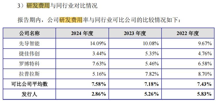 江松科技的研发费用率明显低于同行可比公司均值。报告期内,该公司的研发费用率均值分别为7.43%、7.18%和7.58%。
