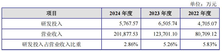 报告期内,江松科技的研发投入金额分别为4705.07万元、6505.74万元和5767.57万元,同期研发投入占营业收入的比例分别为5.83%、5.26%和2.86%。