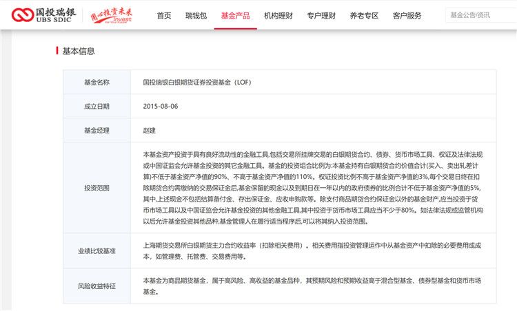国投瑞银官网信息显示,国投白银LOF成立于2015年8月6日,投资范围显示,该基金资产投资于具有良好流动性的金融工具,包括交易所挂牌交易的白银期货合约、债券、货币市场工具、权证及法律法规或中国证监会允许基金投资的其它金融工具。
