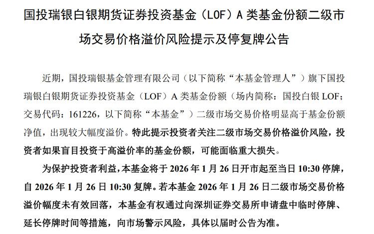 1月25日,国投白银LOF再次发布公告:为保护投资者利益,该基金将于2026年1月26日开市起至当日10:30停牌,自2026年1月26日10:30复牌。若该基金2026年1月26日二级市场交易价格溢价幅度未有效回落,该基金有权通过向深圳证券交易所申请盘中临时停牌、延长停牌时间等措施,向市场警示风险,具体以届时公告为准。