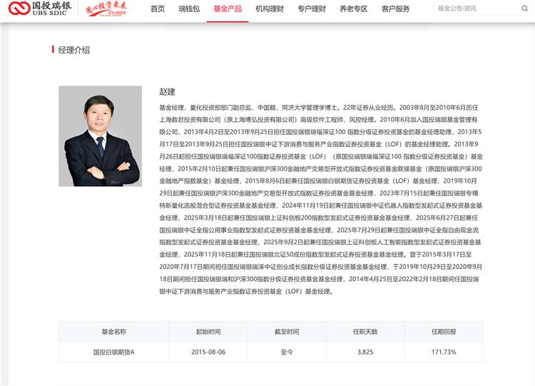国投白银LOF的基金经理为赵建,履历信息显示,赵建是国投瑞银基金经理,量化投资部部门副总监,同济大学管理学博士。22年证券从业经历。2003年8月至2010年6月历任上海数君投资有限公司(原上海博弘投资有限公司)高级软件工程师、风控经理。