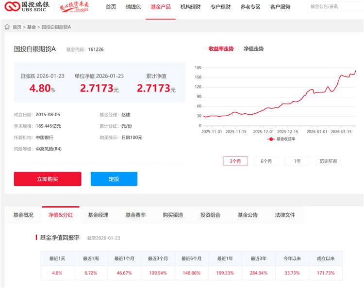 官网信息显示,最近1个月国投白银LOF的净值回报率为46.67%,最近1年净值回报率为199.33%,成立以来净值回报率为171.73%。