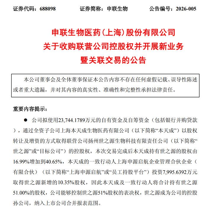 近期,申联生物发布对外收购计划,公司拟使用2.37亿元的自有资金及自筹资金(包括银行并购贷款),通过全资子公司上海本天成生物医药有限公司(以下简称“本天成”)以股权转让及增资的方式取得联营公司扬州世之源生物科技有限责任公司(以下简称“世之源”)的控股权。
