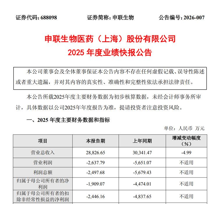 近日,申联生物发布2025 年度业绩快报公告,经初步核算数据,2025年申联生物实现营业收入28,826.65万元,同比下降4.99%。归属于母公司所有者的净利润-1,909.07万元,去年同期为-4,474.01万元。