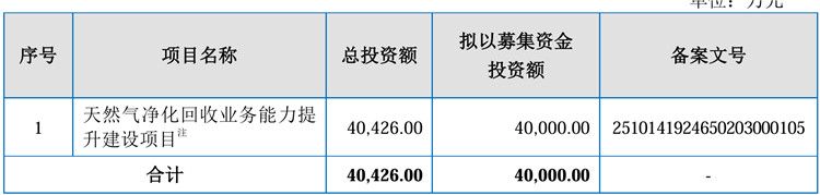 此次,凯龙洁能拟募集资金40,000.00万元用于天然气净化回收业务能力提升建设项目。据悉,该项目总投资为40,426.00万元,其中设备购置费35,706.56万元,安装工程费2,856.52万元, 其他费用1,482.92万元,铺底流动资金为380万元。该项目主要为购置90万方/天处置能力的撬装式天然气净化回收相关设备,拟用于新疆及川渝地区拓展放空天然气净化回收业务规模。