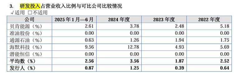 招股书显示,2022年至2025年上半年,凯龙洁能研发投入占营业收入比例分别为 0.64%、0.39%、1.25%和0.87%,而同期可比公司研发投入占营业收入比例平均数为2.52%、1.87%、3.56%、2.56%。