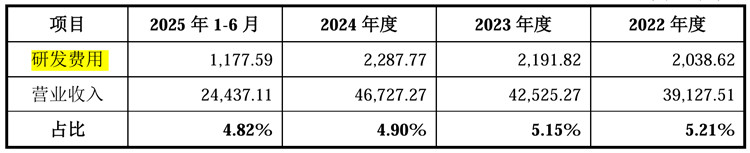招股书显示,报告期内,欣兴工具研发费用2038.62万元、2191.82万元、2287.77万元和1,177.59万元,占当期营业收入的比例分别为5.21%、5.15%、4.90%和4.82%,同期可比公司的研发费用率分别为6.49%、6.84%、6.88%和6.27%,高于欣兴工具的研发费用率。