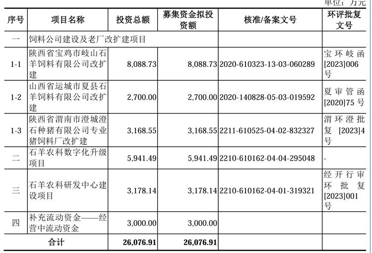 申报稿显示,此次石羊农科拟募集资金约2.61亿元,所募资金投向饲料公司建设及老厂改扩建项目、石羊农科数字化升级项目、石羊农科研发中心建设项目、补充流动资金——经营中流动资金。